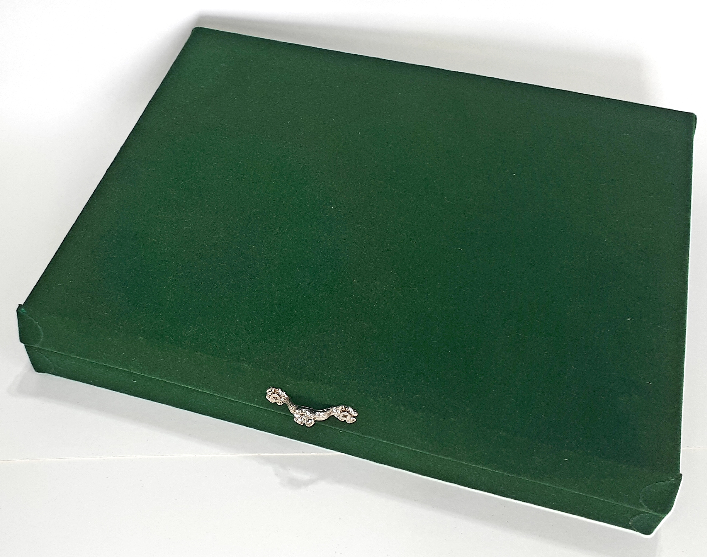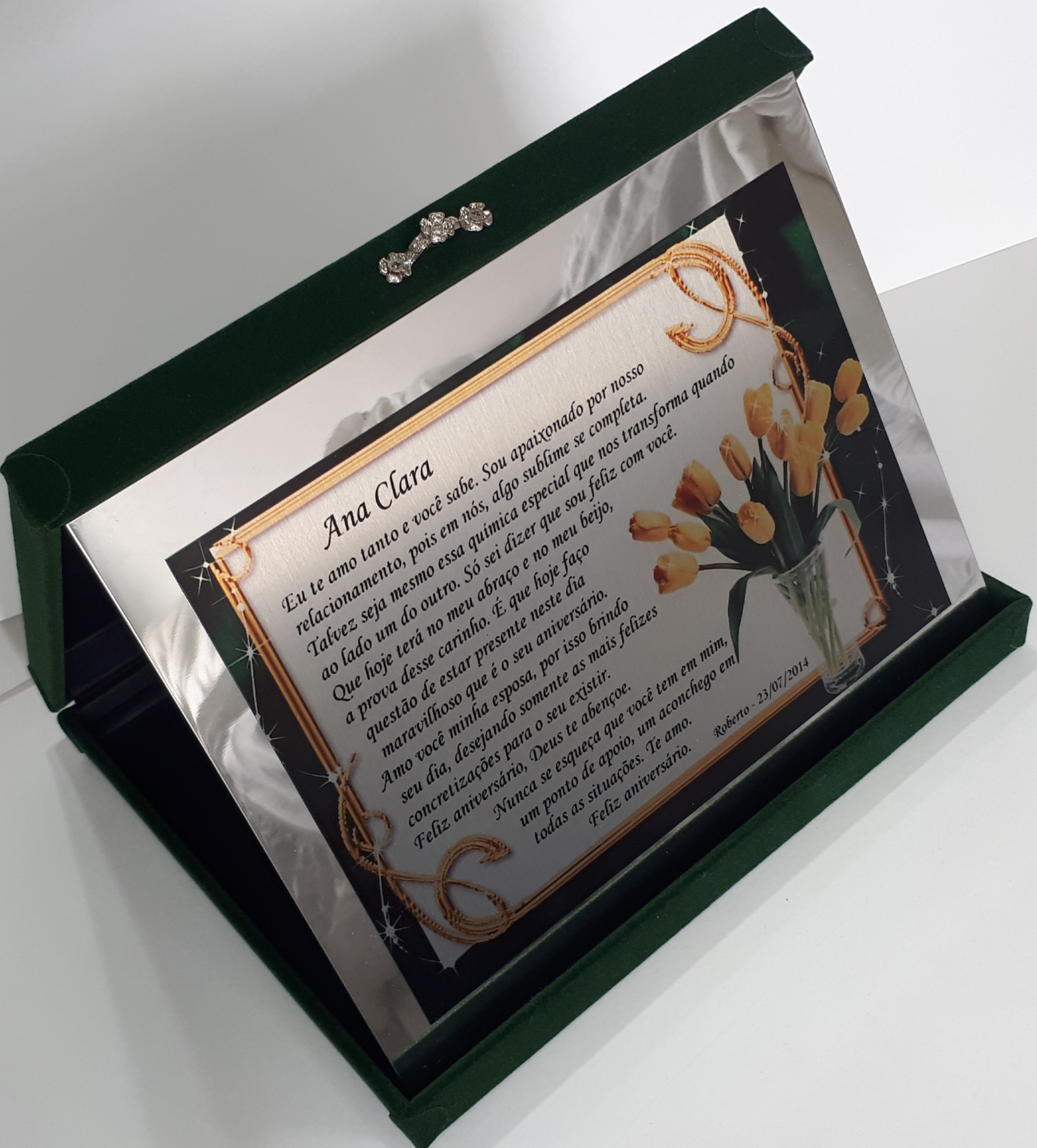PLACA-ESTOJO SUPER CLÁSSICO: Conhecidas no mercado como Placas de Homenagem. Este modelo de estojo forrado com veludo TNT verde bandeira possui uma ABA DE AÇO INOXIDÁVEL ESPELHADO (polido que reflete como um espelho), onde será afixada a placa de 15 x 9cm (pequena), de aço inoxidável, porém escovada e gravada com a arte solicitada e aprovada por você. A PLACA-ESTOJO SUPER CLÁSSICO é fornecida em três tamanhos de placas gravadas e seis cores de estojos a escolher por quem prestará a homenagem.
