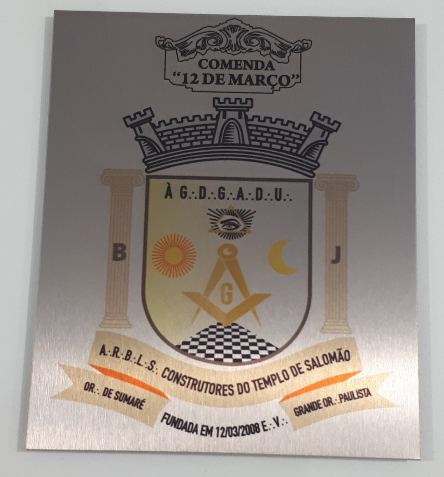 PLACA DE INAUGURAÇÃO De obras, edifícios, igrejas, escolas e outros ambientes internos. Placa gravada pelo PROCESSO DE SUBLIMAÇÃO em aço inoxidável, cantos vivos, 4 furos opcionais. Medidas padronizadas 80cm x 60cm, ou comprimento x largura opcionais, com até 4.800cm². Instalar somente em AMBIENTES INTERNOS, sem a presença da luz do dia, a qual faz a pintura clarear, em poucos meses.