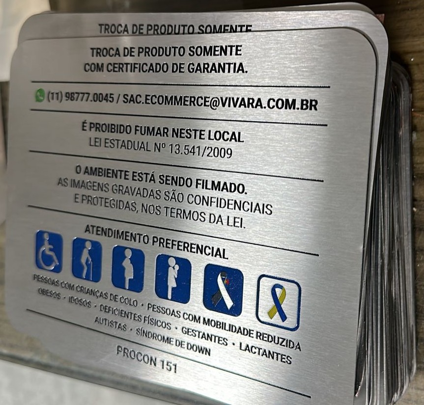 PLACA DE INDICAÇÃO De salas, escadas, elevadores, departamentos, outros locais, instalações e produtos diversos. Placa gravada pelo PROCESSO DE FOTOCORROSÃO em aço inoxidável, cantos vivos, sem furos. Acompanha bisnaga de silicone para fácil fixação. Medidas padronizadas 38cm x 28cm, ou comprimento x largura opcionais, com até 1.064cm². Permite a instalação em AMBIENTES EXTERNOS. Aplicação de tinta com secagem ultravioleta.