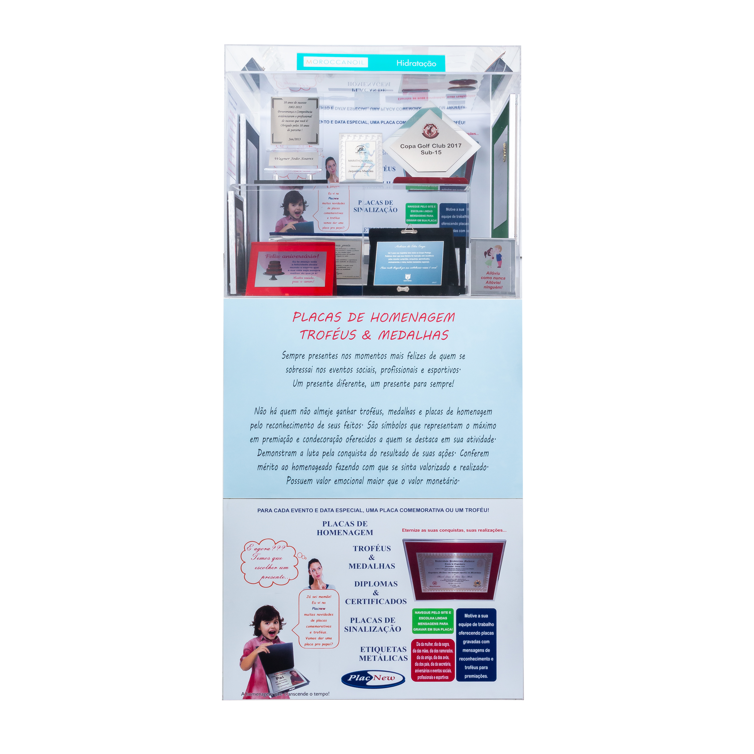 Foto mostrando como você receberá a sua Lojinha de Placas: Dois nichos feitos de MDF com os Banners chamativos e, sobre eles, a MINI-LOJA: Caixa de acrílico cristal com os produtos básicos personalizáveis. Ideal para Lojas de artigos para presentes. Veja preços de atacado dos produtos da Loja Virtual Real para REVENDA DE PRODUTOS PERSONALIZADOS no site: www.osociobr.com.br