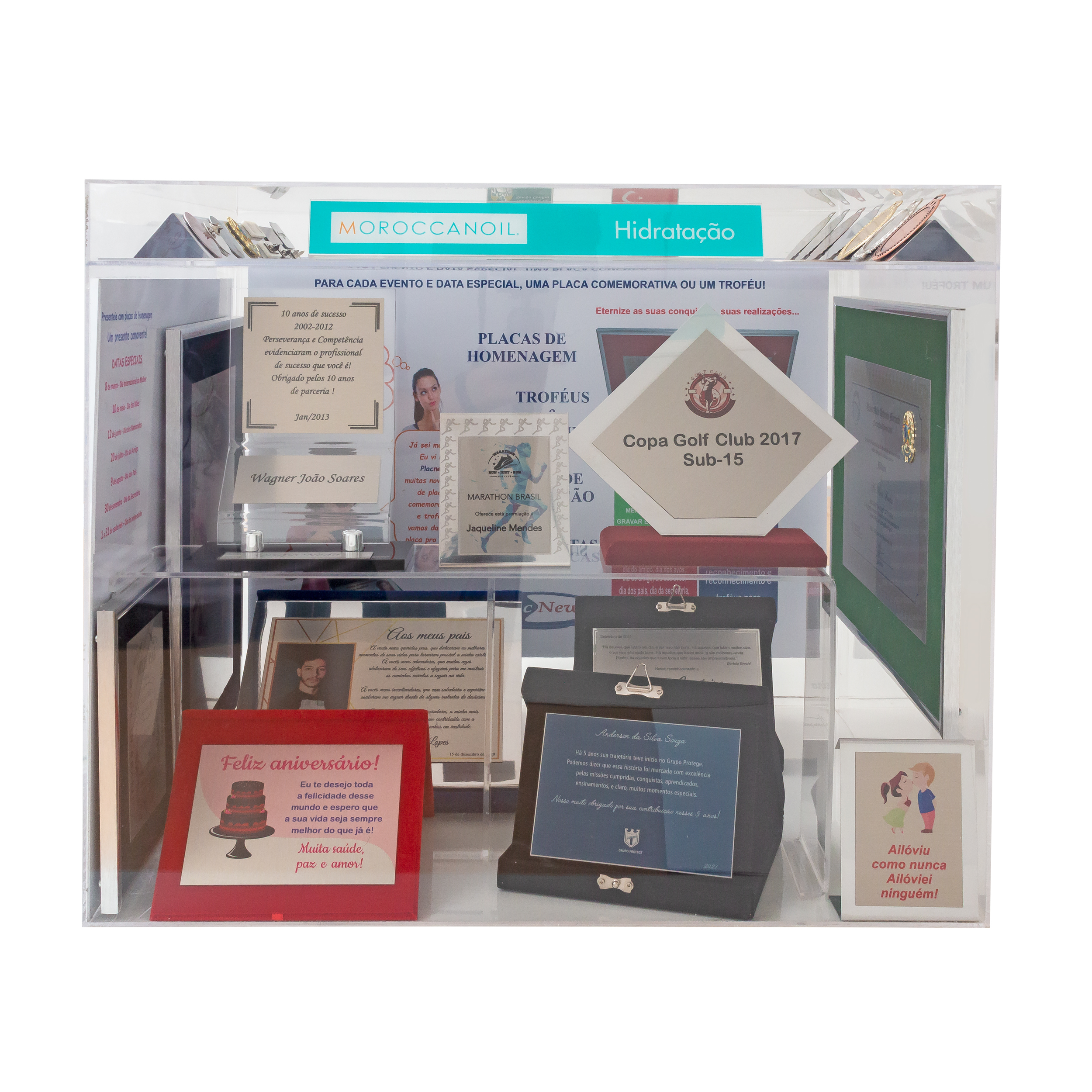 Foto mostrando a caixa de acrílico cristal: A MINI-LOJA de seus clientes em sua loja. Contém vários produtos personalizáveis da Loja Virtual Real, como Placas de Homenagem. Placas, Plaquetas, Plaquinhas, Troféu & Medalhas. Veja preços de atacado dos produtos da Loja Virtual Real, para REVENDA DE PRODUTOS PERSONALIZADOS no site: www.osociobr.com.br