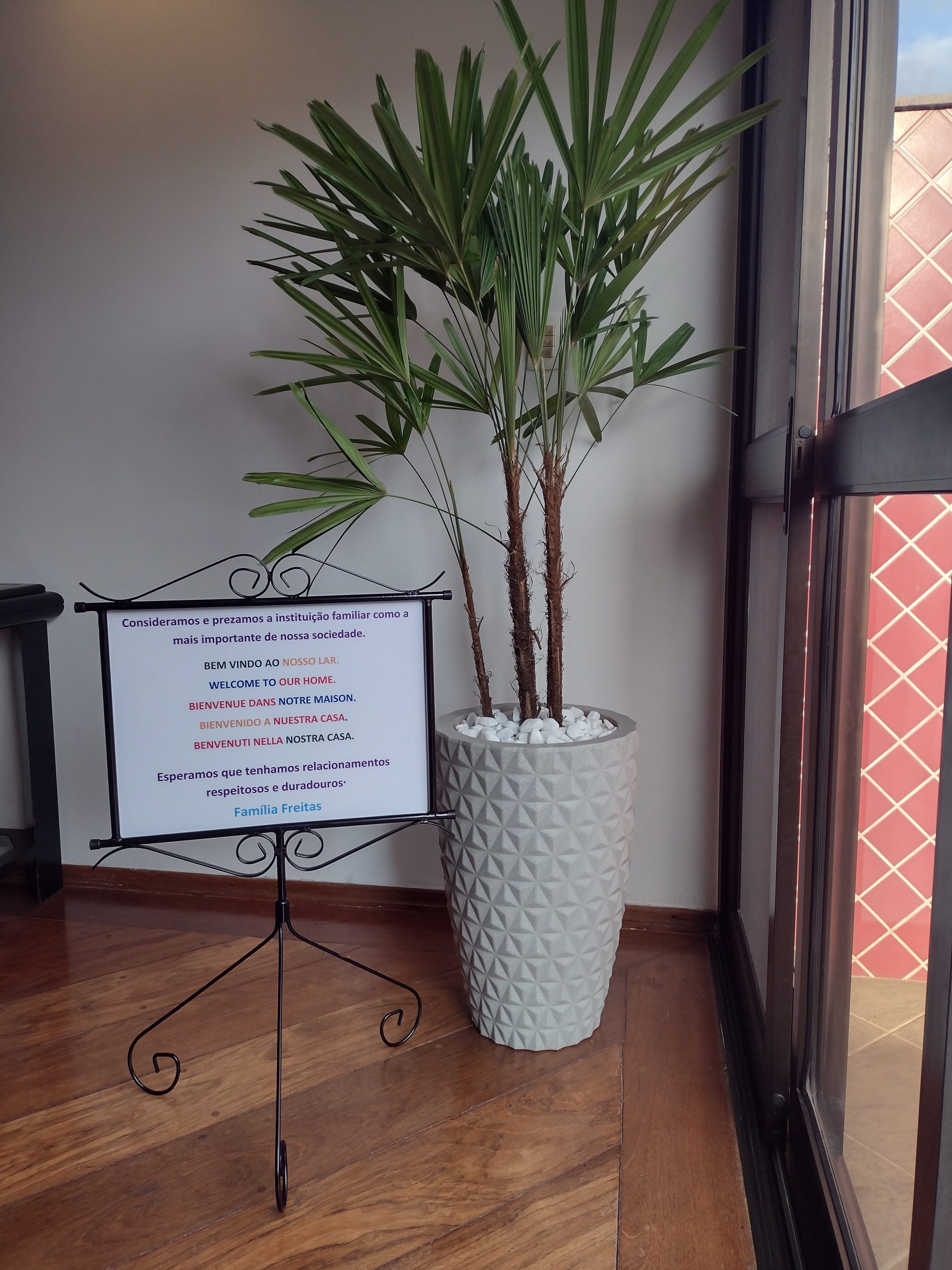 Recepcione, em seu lar, familiares e amigos, com frases de BOAS VINDAS, impressas nesse lindo Totem artístico que, preferencialmente poderá ser colocado na entrada da sua sala de visitas. Medidas da placa de PS impressa: 48cm x 38cm x 3mm. Altura do pedestal de ferro pintado com tinta eletrostática: 90 centímetros. Fornecido desmontado.
