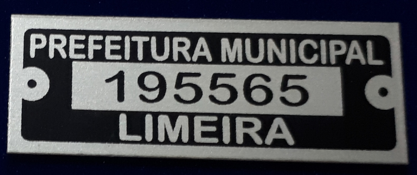 PLACA DE IDENTIFICAÇÃO De máquinas, equipamentos, prateleiras, móveis e patrimônio. Placa gravada pelo PROCESSO DE SUBLIMAÇÃO em aço inoxidável, cantos vivos, sem furos. Acompanha bisnaga de silicone para fácil fixação. Medidas padronizadas 4cm x 2cm, ou comprimento x largura opcionais, com até 8cm². Instalar somente em AMBIENTES INTERNOS, sem a presença da luz do dia, a qual faz a pintura clarear.