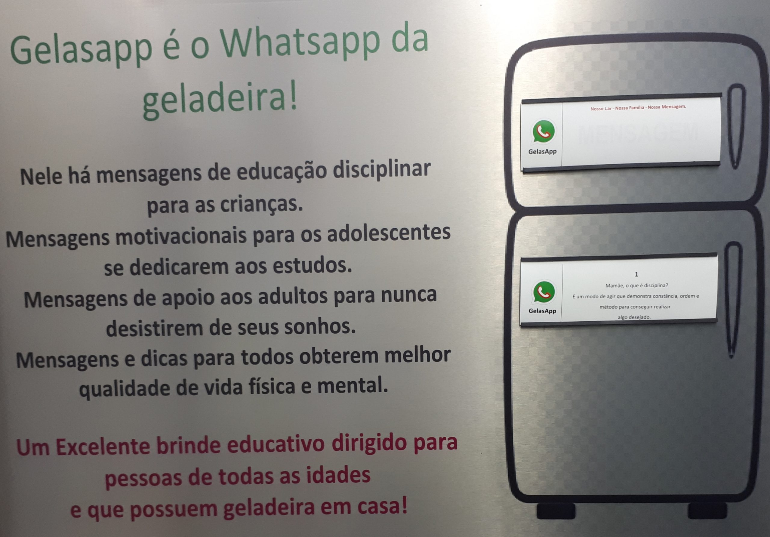 GELASAPP é o whatsapp da geladeira. Nele há mensagens de educação disciplinar para as crianças. Mensagens motivacionais para os adolescentes. Aos adultos para sempre seguirem em frente com os seus objetivos, nunca desistindo e superando os obstáculos. Mensagens e dicas para todos obterem melhor qualidade de vida física e mental. Kit Gelasapp composto por 2 porta-etiquetas magnéticos, 31 cartões com mensagens dirigidas às pessoas acima citadas. 30 cartões para escrever avisos e mensagens diários pelas pessoas da família. Medidas 14cm x 47mm. Acompanha uma caneta BIC azul com imã neodímio para deixá-la sempre disponível na porta de geladeira.