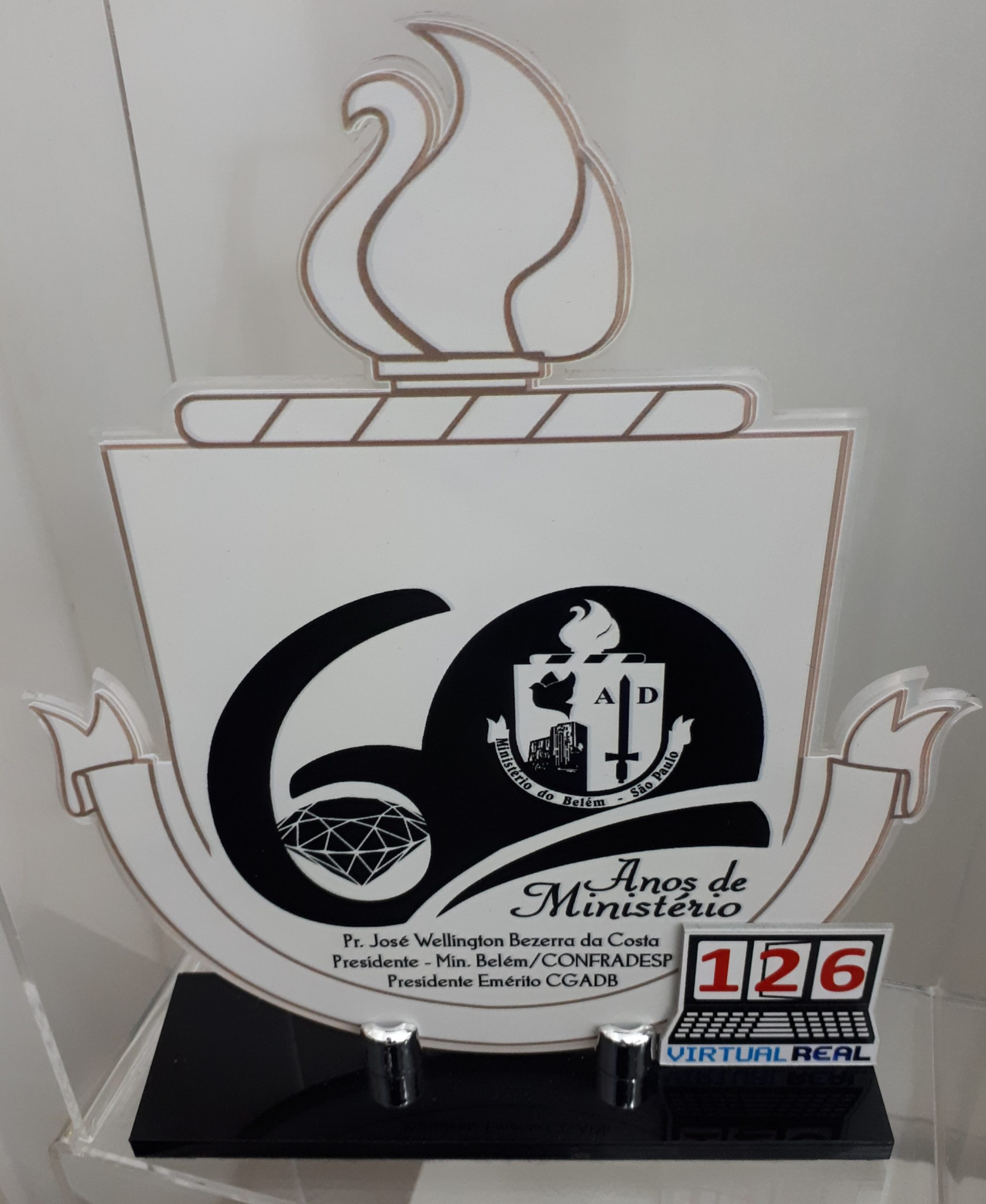TROFÉU RELIGIOSO Troféu oferecido aos membros da instituição religiosa em comemoração de diversos eventos, como o do aniversário de sua fundação. Torre de acrílico cristal com medidas de até 19cm x 24cm x 4mm. Base de acrílico preto com medidas de até 18cm x 5cm x 8mm. e 2 suportes-fenda.